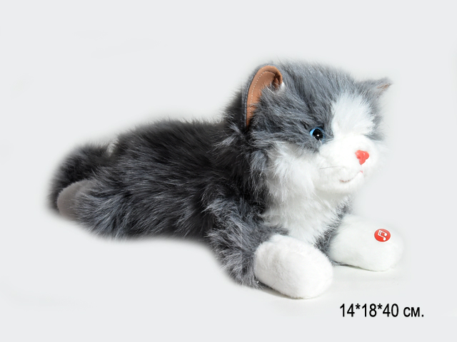 им Кошка арт. 209093 Пушистая серая с белым лежит мяукает 40 см в пак.