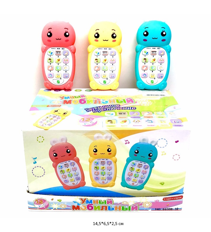 Телефон арт. 6610B-12 "Зайка" цвета микс муз. на батар. (12 шт.) шоубокс_•Каждая кнопка преподнесет сюрприз и поднимет настроение. Благодаря своим габаритам, игрушка удобно ложится в детскую ручку.