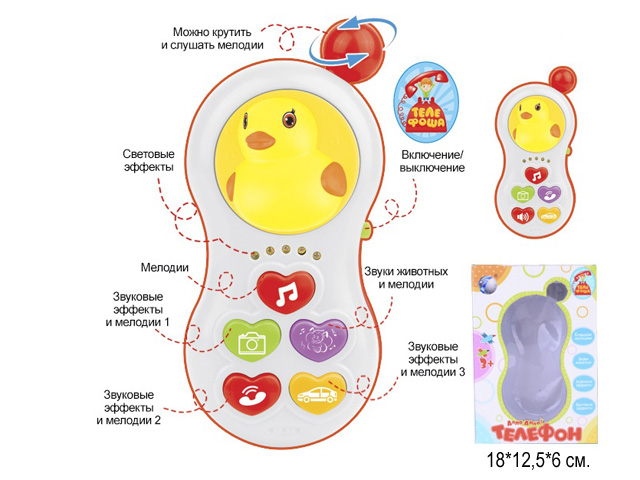 Телефон арт. 6688-4" "Цыпленок" на батарейках в коробке 18*12,5*6Каждая кнопка преподнесет сюрприз и поднимет настроение. Благодаря своим габаритам, игрушка удобно ложится в детскую ручку.