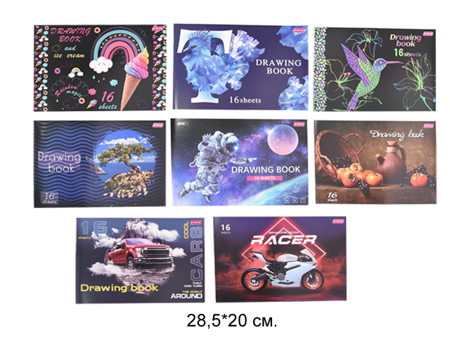 Содержит 20 листов плотностью 100 г/м2 формата А4 (202х285 мм). Красочная обложка выполнена из мелованного картона. Скрепление листов осуществляется с помощью скрепки. Подходит для смешанных техник рисования: красками, карандашами и фломастерами.