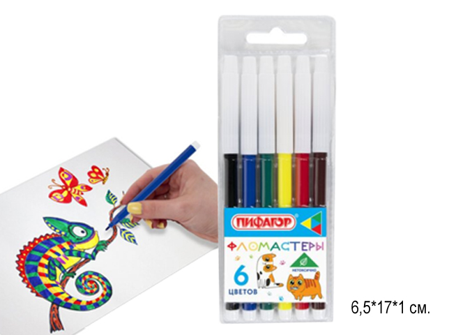 кс_Фломастеры ПИФАГОР, "ВЕСЕЛЫЕ ПИТОМЦЫ", 152451 6 цветов, невентилируемый колпачокОбладают яркими цветами в количестве 6 штук. Длина корпуса удобной круглой формы составляет 141 мм, а диаметр - 7,5 мм. Благодаря толщине линии письма 1 мм и диаметру пишущего узла 1,8 мм процесс раскрашивания становится легким.
