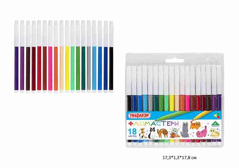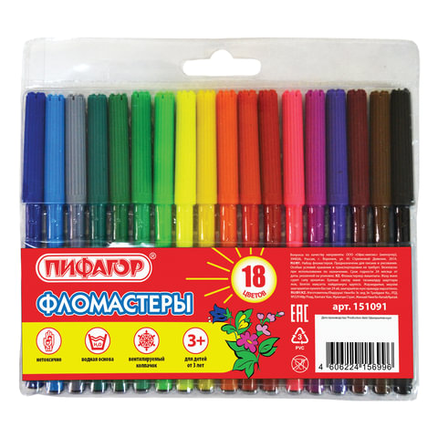 кс_Фломастеры ПИФАГОР, 18 цветов, вентилируемый колпачок, 151091Обладают яркими цветами в количестве 18 штук. Удобная круглая форма корпуса, длина которого 131 мм, а диаметр - 7 мм. Благодаря толщине линии письма 1 мм и диаметру пишущего узла 1,8 мм процесс раскрашивания становится легким. Длина письма составляет 400 м: такого расхода хватит надолго.
