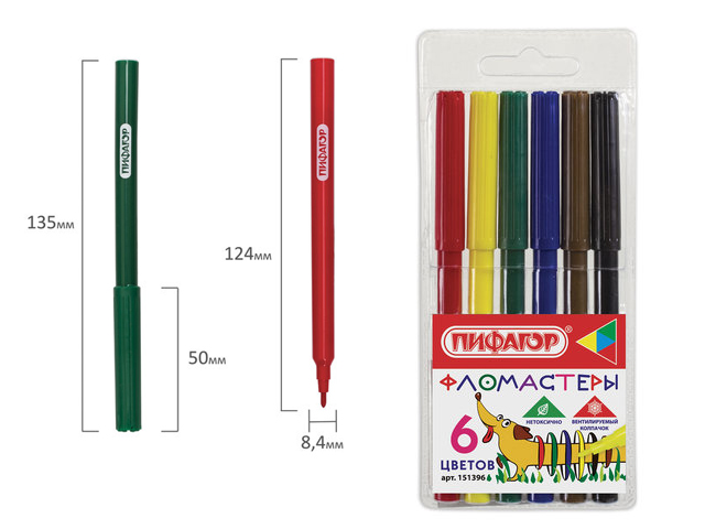 кс_Фломастеры арт. 151396 ПИФАГОР "Веселая такса", 6 цветов, вентилируемый колпачокОбладают яркими цветами в количестве 6 штук. Имеют удобную круглую форму корпуса, длина которого 135 мм, а диаметр - 8,4 мм. Благодаря толщине линии письма 1 мм и диаметру пишущего узла 1,8 мм процесс раскрашивания становится легким. Длина письма составляет 600 м: такого расхода хватит надолго. Фломастеры легко смываются с большинства материалов и кожи. Корпус изготовлен из качественного полипропилена, который значительно продлевает срок службы фломастеров. Колпачок имеет специальные прорези для вентиляции, которые способствуют прохождению воздуха при попадании в дыхательные пути малыша. Рекомендованы для детей от 3-х лет.