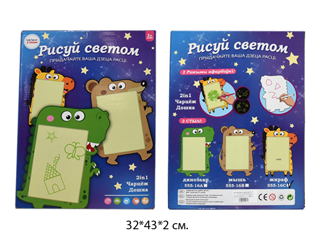 Доска для рисования в темноте состоит из фотолюминесцентного ПВХ-материала, который быстро накапливает свет от источника освещения, и потом некоторое время светится в темноте, постепенно затухая. Яркость свечения можно регулировать продолжительностью свечения, а толщину линии можно менять удалением светового маркера от планшета. Рисунок держится на доске примерно 30 минут, после чего полностью исчезает, и можно снова рисовать. Источник питания для светового маркера: батарейки AG3x1,5V (есть в комплекте)