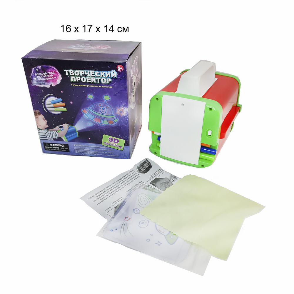Проектор позволяет детям создавать свои собственные оригинальные произведения искусства прямо на многоразовом экране, а затем проецировать свои творения на стену, потолок – везде, где они захотят! Проектор поставляется с 3-мя яркими маркерами, которые легко стираются влажной тканью, которая входит в комплект!