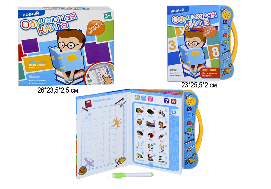 В книге 10 страниц, на каждой из них есть кнопка включения. Ребенок сможет изучать не только цифры и буквы, но и название предметов и звуки. В книге много разнообразных заданий, для выполнения которых прилагается фломастер на водной основе, который легко стирается при необходимости специальной губкой. А на последней странице есть веселые детские песенки.