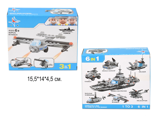 Размер упаковки: 15,5 х 14 х 4,5 см220.25 руб. - Конструктор арт. A010-5 Военная техника 82 дет. в кор.~×Конструктор арт. A010-5 Военная техника 82 дет. в кор.~Конструктор военный самолет 3 в 1 из которого можно так же собрать истребитель и пушку.