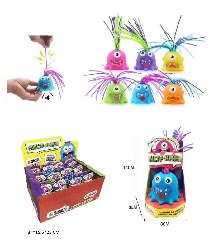 Забавный монстр-дразнилка, который умеет издавать смешные звуки. Потяните крикуна за волосы, чтобы он закричал. Если тянуть его каждые 2 секунды, то он будет кричать с разными звуками. Тяните за волосы в течение 5 секунд для более протяжного возгласа. В репертуаре 5 смешных звуков.