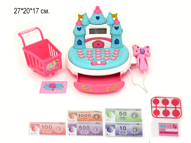 Устраивайте супермаркет прямо у себя дома с оригинальным кассовым аппаратом. Его внешний вид напоминает замок с несколькими башнями. Функции, которыми оснащен кассовый аппарат позволяют ребенку почувствовать себя настоящим кассиром, а встроенный в него калькулятор поможет ему ознакомиться с азами арифметики. Настоящую атмосферу магазина создадут функционирующий сканер и открывающаяся касса в которой хранятся деньги. Кроме этого, игрушка комплектуется дополнительными аксессуарами, которые будут служить в качестве товара. Вместе с таким набором и благодаря функциям кассового аппарата игра девочки станет настоящим праздником.