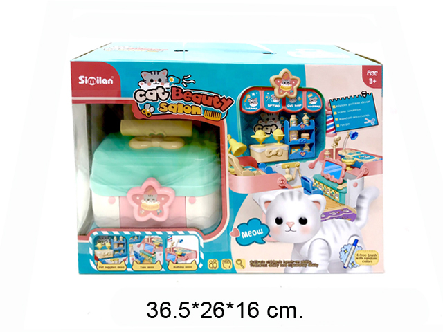 В наборе домик котёнок и груммерная комната в виде симпатичного чемоданчика, в котором есть всё необходимое, чтобы как следует по ухаживать за пушистым питомцем.