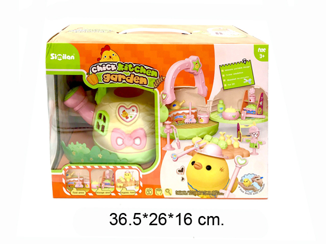 В наборе домик цыплёнка в виде чайичка, внутри которого грядки, полочки и различный инвентарь для выращивания овощей.