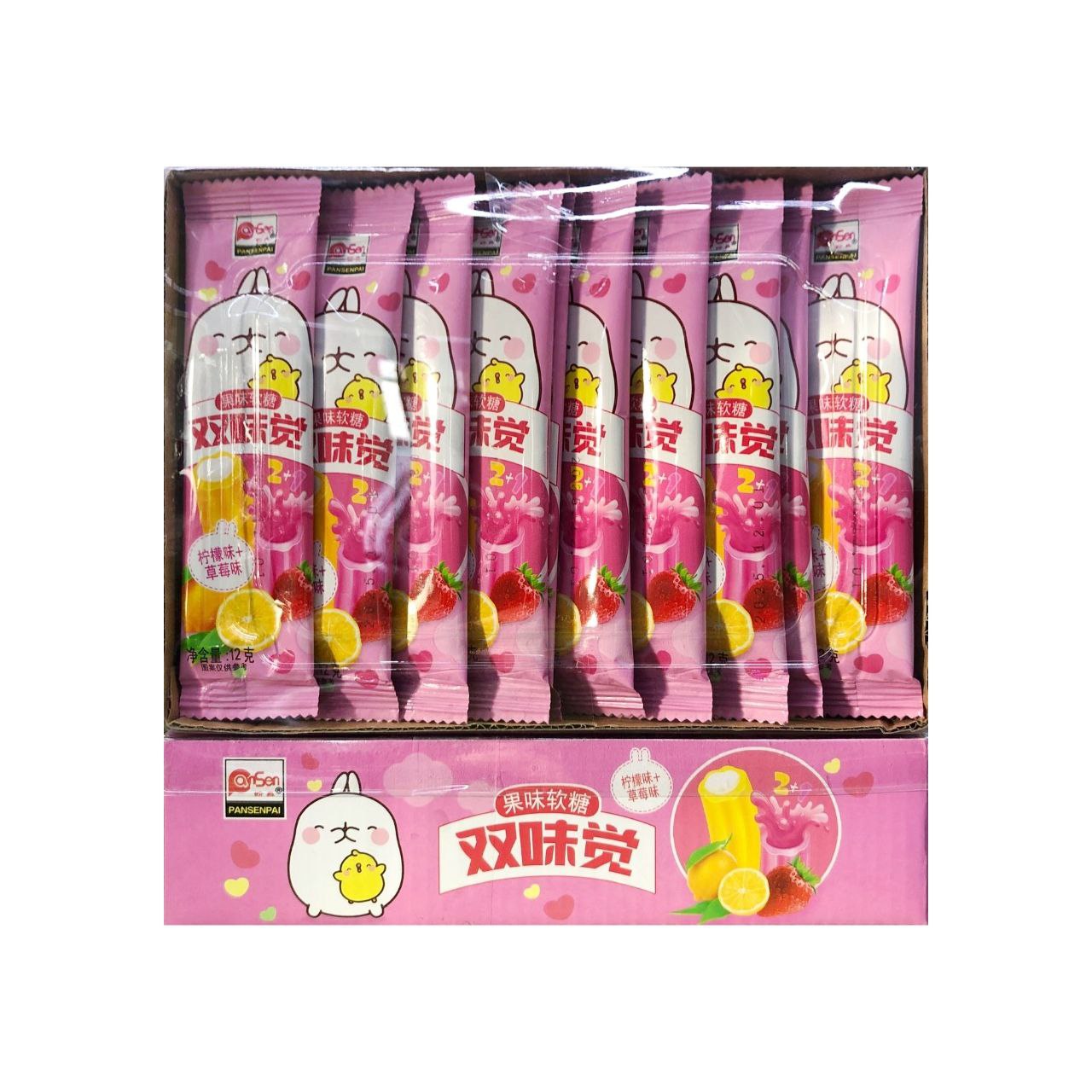 Конфета арт. 960090-2 Жевательная Трубочка-тянучка "Лимон-клубника" 12 г 30 шт в розовой кор.*