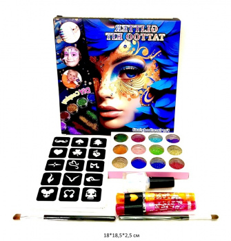 В наборе: трафареты 15 шт, блёстки 12 оттенков, клей 2 бутылька, набор кисточек для нанесения тату