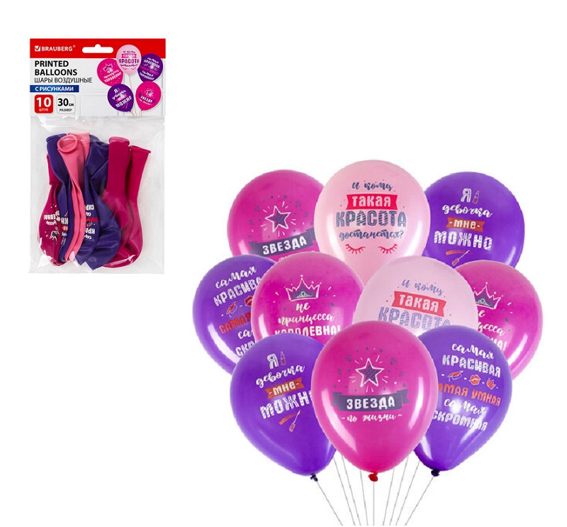 Высококачественные шары классической формы с рисунком "С Днем Рождения". Изготовлены из натурального латекса, обеспечивающего прочность изделия при аккуратном использовании. Стандартный размер - 30 см. 5 шаров 5 разнообразных насыщенных цветов украсят любой интерьер.137.67 руб. - кс_Шары воздушные арт. 591892 30 см, 10 шт. "Приколы для неё" ассорти BRAUBERG×кс_Шары воздушные арт. 591892 30 см, 10 шт. "Приколы для неё" ассорти BRAUBERGНабор воздушных шаров с принтами "Приколы для неё" предназначен для украшения помещений и создания праздничных композиций. Оформление воздушными шарами - простой и доступный способ сделать праздник ярче и веселее! Высококачественные шары классической формы. Изготовлены из натурального латекса, обеспечивающего прочность изделия при аккуратном использовании. Стандартный размер - 30 см. 10 шаров разных цветов с принтами украсят любой интерьер. В наборе представлены 5 видов шаров, по 2 экземпляра каждого вида.